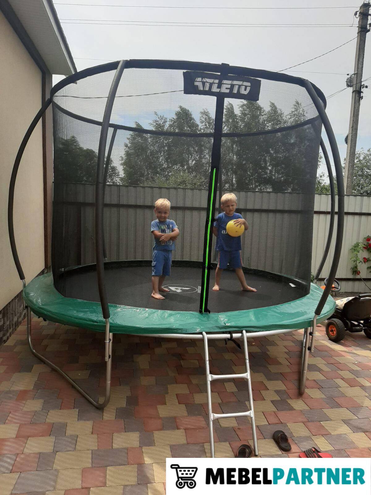 Батут Atleto 252 см (12 ft) с  лестницей изготовлен из высококачественных материалов, что обеспечивает его долгий срок службы. Батуты являются безопасными для пользователя, так как конструкция закреплена таким образом, чтобы защитить от травм. Батуты созданные в соответствии со стандартами безопасности, установленными в ЕС.