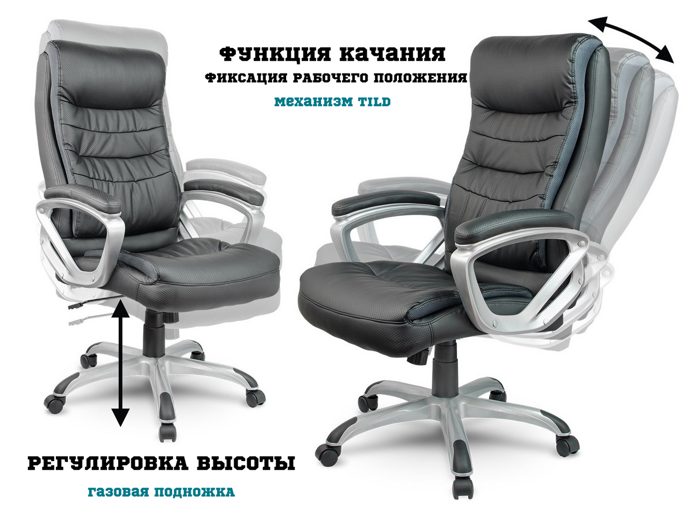 Механизмы.  Механизм качания, установленный в данной модели, даст возможность расслабиться. Управлять этим механизмом очень просто с помощью рычага под сидением. Газлифт поможет отрегулировать до оптимальной высоты. В верхнем положении кресло имеет большую посадку. Регулируемый механизм качания под вес сидения. Пружина зажимается под больший вес, и наоборот, ослабляется под меньший.