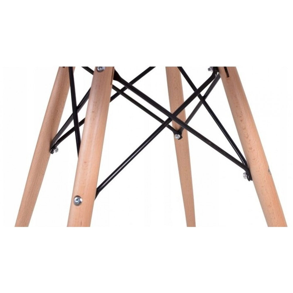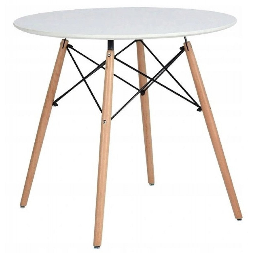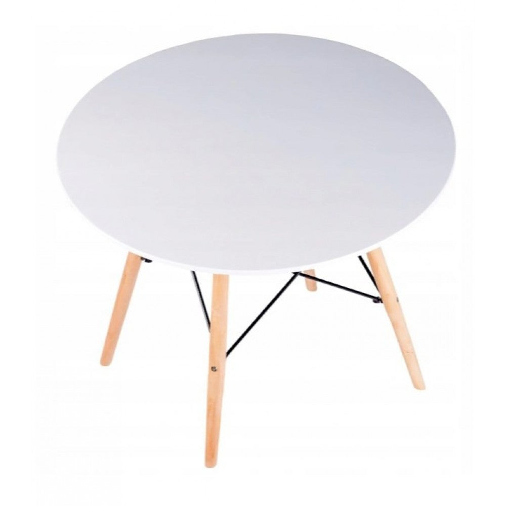 Круглая форма и небольшая толщина крышки стола позволяет ему компактно размещаться даже в небольшом помещении. Четыре тонкие прямые ножки, выполненные из дерева, изолированно под небольшим наклоном, что придает дополнительную устойчивость. Они крепятся при помощи стальной черной фурнитуры, имеющей безопасные заглушки на концах, того же цвета.