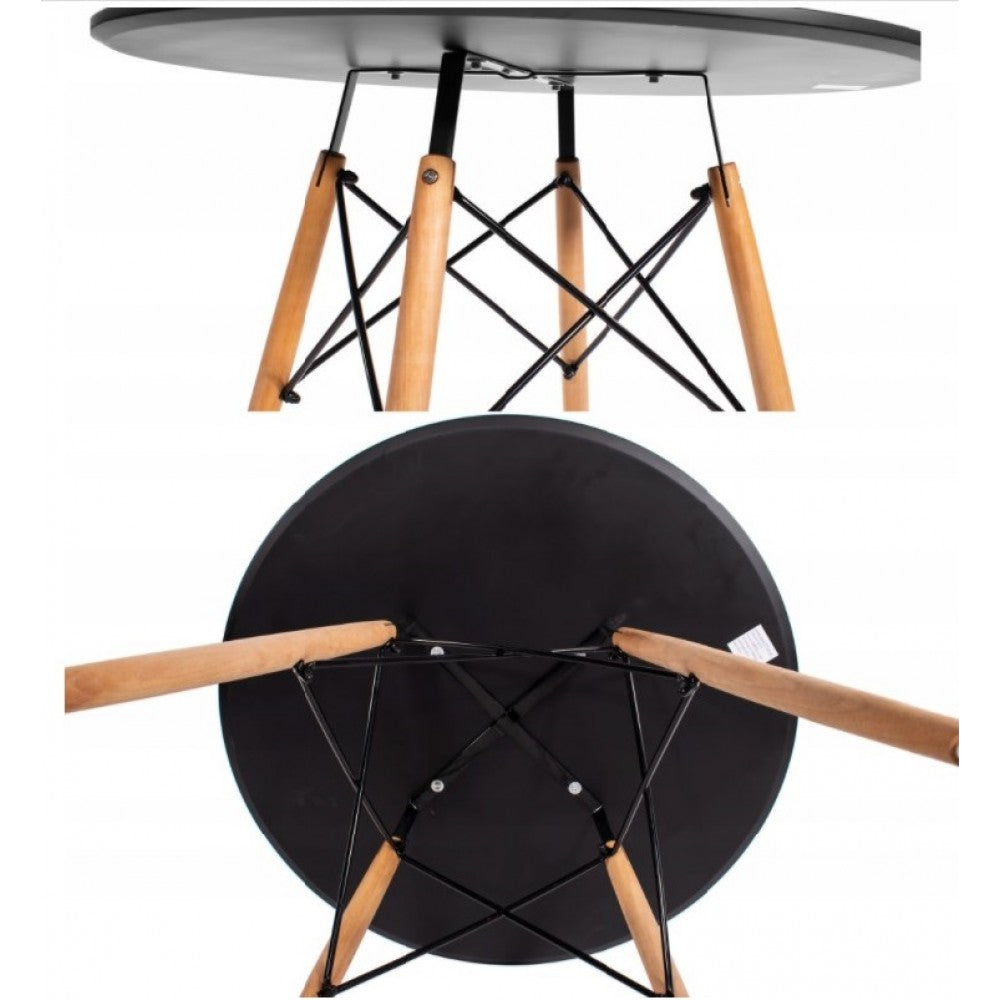 Круглая форма и небольшая толщина крышки стола позволяет ему компактно размещаться даже в небольшом помещении. Четыре тонкие прямые ножки, выполненные из дерева, расположены под небольшим наклоном, что придает конструкции дополнительную устойчивость. Они крепятся при помощи стальной черной фурнитуры, имеющей безопасные заглушки на концах, того же цвета.